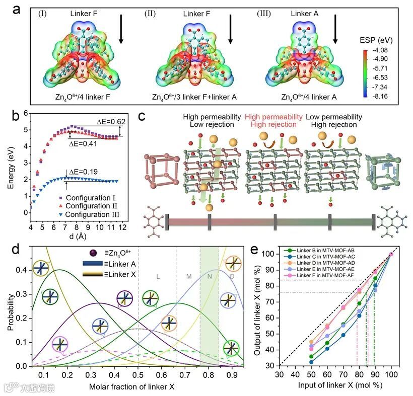 研究团队将数学模型应用于膜材料原子尺度设计,通过精确调控不同功能化配体在膜层间的空间分布,以及在微结构骨架中的相对比例,成功构筑了具有局部限制性传输通道的周期性交替结构。其中,狭窄的局部限制性通道提供精确的分子尺寸筛分功能,确保高选择性,而相邻的宽阔通道则显著降低了小分子的传输阻力,大幅提升膜渗透通量。这种协同效应通过密度泛函理论计算与分子动力学模拟进行了系统阐释和验证。
