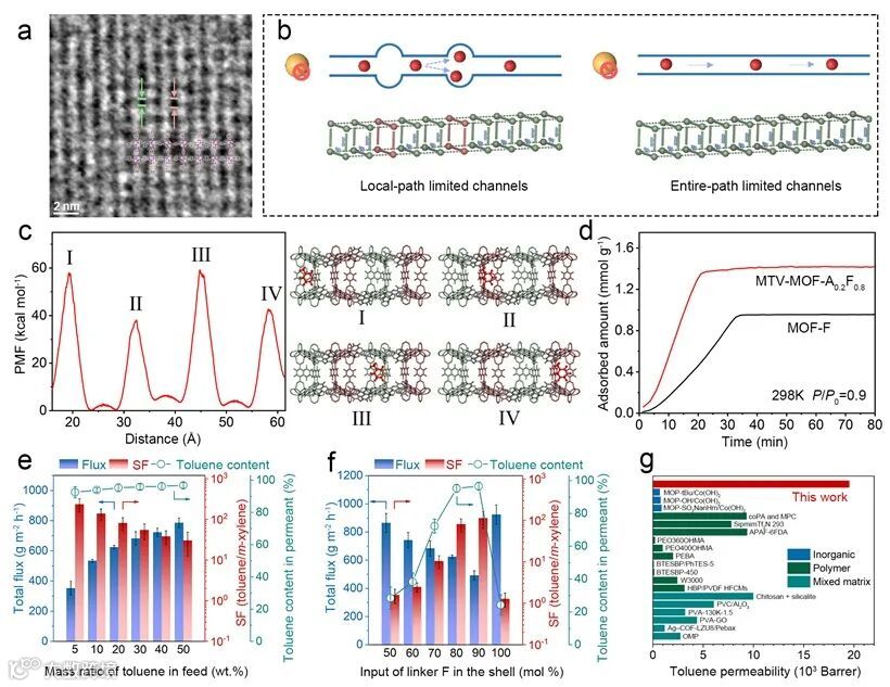 实验结果表明,多变量配体策略使得膜的有效筛分孔径在亚纳米尺度上实现精准调控,该类MTV-MOF中空纤维膜在分离甲苯与间二甲苯时表现出优异性能:分离因子高达234.3,同时甲苯渗透通量达到创纪录的19,511.1 Barrer,成功突破了膜材料的分离性能极限。