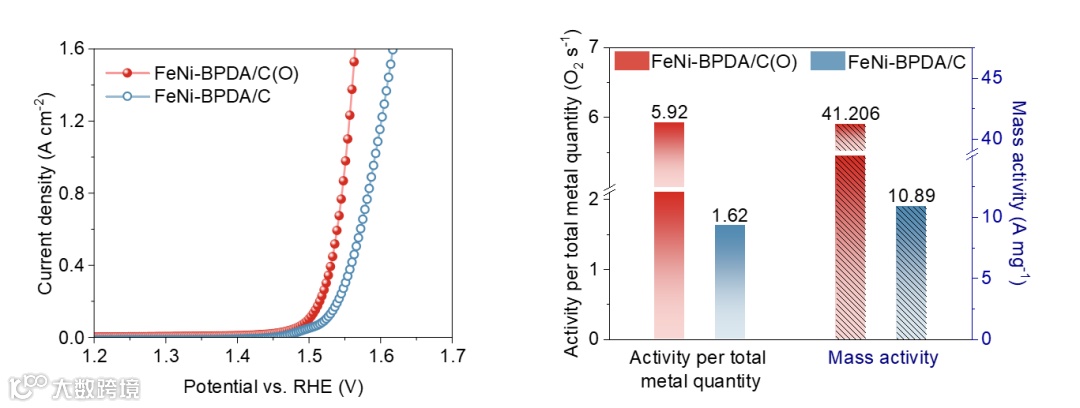 在本研究中,研究团队提出了一种基于超分子载体结构设计的策略,通过在碳载体表面引入功能化基团,有效调控其电子云结构,从而增强分子配合物与载体之间的非共价相互作用。该策略显著缩小了金属配合物与氧化碳载体之间的空间间距,进而提升了电子耦合效率与催化体系的整体稳定性。在电催化析氧反应(OER)中,该结构优化使催化剂实现了高达1.5 A cm-2的大电流密度输出,并在过电位为0.33 V的条件下展现出高达41,206 A g-1(以Fe/Ni计)的质量活性,性能显著优于当前多数已报道的分子级OER催化剂。