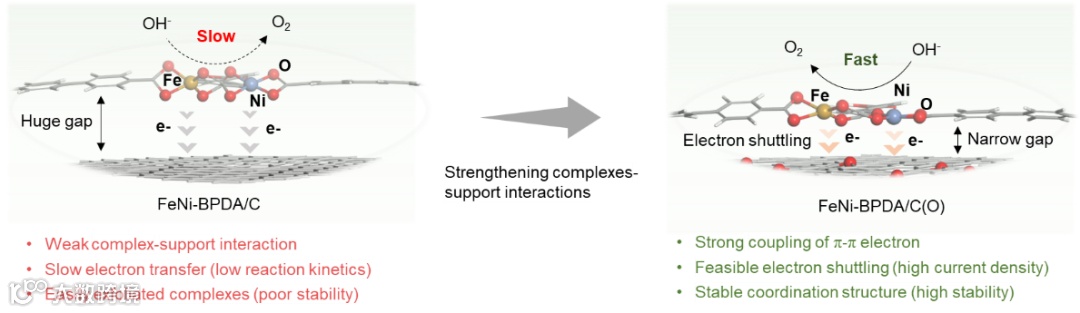 为解决上述难题,研究团队通过调控碳载体表面的氧官能团类型与密度,构筑了更紧密的分子配合物-碳界面,增强了配体与碳载体之间的电子耦合与结构稳定性。这一空间界面工程策略有效缩短了电子传输路径,并显著提高了配合物的负载牢固度,使其在碱性介质中实现安培级电流密度的稳定OER反应。系统电化学测试表明,界面间距越小,电子穿梭效率越高,电催化反应速率显著提升;而通过界面调控引入的非共价相互作用还在一定程度上抑制了配合物的解离与重构,延长了催化剂的服役寿命。该研究不仅从界面工程的视角深入揭示了负载型分子配合物在OER中的活性机制,也为开发结构明确、性能优越的分子级电催化剂提供了理论指导与实践范式。