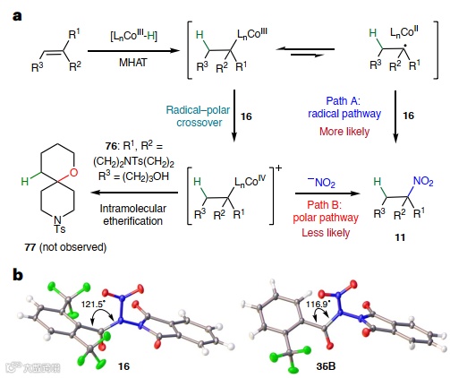 接下来,作者研究了烯烃氢硝化反应的机理。他们首先提出了两个重要的问题:(1)这是传统的 MHAT 反应(图5a,路径A)还是试剂在自由基极性交叉途径中充当氧化剂(图5a,路径B)?(2)异头硝基酰胺试剂16有什么特殊之处,使其有利于N而不是O加成(图5b)?为了解决第一个问题,在本研究过程中,从未检测到用i-PrOH 拦截假定的碳正离子而产生的醚化副产物。即使在烯烃76的反应中可能形成分子内醚,也没有观察到醚产物 77。虽然这并不能成为该机理的确凿证据,但结合大量的 MHAT 文献,可以推测标准的自由基途径是有效的。关于第二个问题,作者对所有测试的硝化剂进行了一系列计算实验(图2c)。目前最好的假设是,两个邻位CF3基团的存在以某种方式屏蔽了侧硝基上的氧原子,从而有利于自由基进攻氮原子(图5b)。事实上,X-射线晶体学分析表明,与单CF3试剂35B相比,试剂16呈现出更类似于“杯”的形状,屏蔽了硝基上的氧原子。