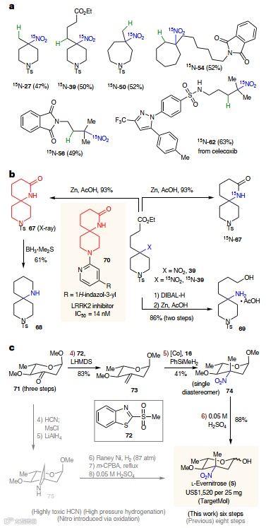 15N同位素标记在各种不同情况下具有广泛的应用前景。鉴于硝基酰胺16易于制备,相应的15N标记试剂可用廉价的NH415NO3(约170美元/克,图1d)制备,并可在相同反应条件下进行评估(图4a)。底物15N-27、15N-39、15N-50、15N-54、15N-56和15N-62可按照相同的通用方法使用15N-16制备,产率与未标记类似物相当。鉴于硝基基团在下游功能化方面的多功能性,预计这种简单的15N掺入方法将得到广泛应用。如化合物39的两种同位素形式均可在先验条件下转化为螺环内酰胺67、哌啶68和氨基醇69(图4b)。其中,67的核心骨架是一种具有重要生物学意义的二哌啶螺环化合物,用于药物研发(市售价格约为1,100 美元/克)。如含有该亚基的化合物 70 对富含亮氨酸重复激酶2(LRRK2)表现出良好的抑制活性,IC50为14 nM。该方法的合成应用潜力在 l-evernitrose(5,每25毫克1,520 美元)的合成中也得到了进一步的证明。l-evernitrose 是一种天然存在的硝基糖,存在于抗生素everninomicins B–D 中。这种独特的糖引起了合成化学界的极大兴趣,迄今为止已报道了五种合成路线,通常需要8-15步。已报道的最短序列始于酮糖 71(由廉价的鼠李糖吡喃糖苷经三步衍生而来),需要有毒的 HCN、LAH、高压 Raney-Ni 还原氮丙啶开环,然后将 α-三级胺氧化为硝基。而在本文中,相同的起始原料可以用试剂72烯烃化为73,在标准条件下氢硝化,得到单一非对映异构体74,最后水解74得到5(图4c)。