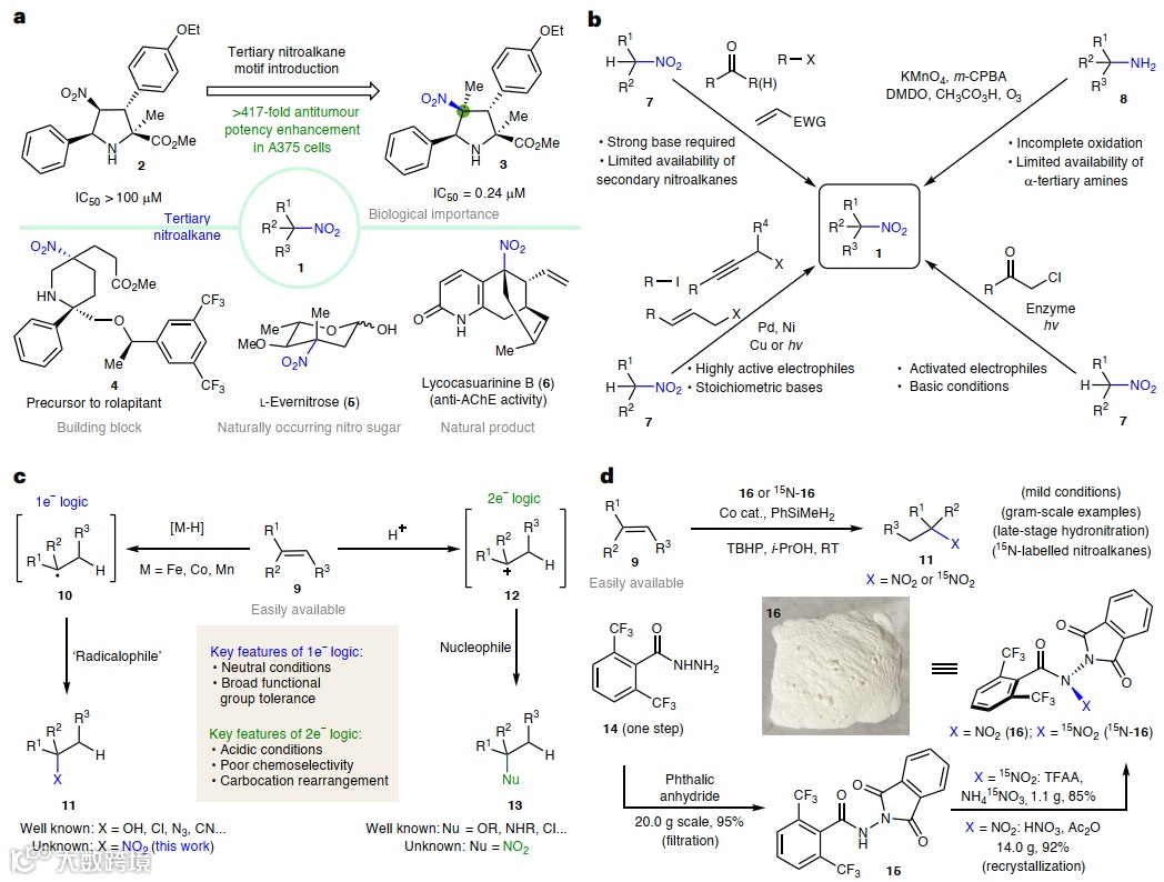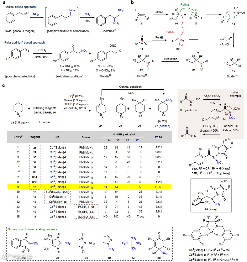 含硝基脂肪族结构广泛存在于药物、农用化学品、含能材料、天然产物以及合成砌块之中,其中,三级硝基烷及其还原产物α-三级胺尤其重要(图1a)。如吡咯烷3在人黑色素瘤细胞系A375中的抗肿瘤效力与2相比有显著提升。传统的三级硝基化合物的合成路线通常依赖于极性键的断开,如图1b所示。在过渡金属或酶催化下,使用强碱或强亲电试剂与二级硝基化合物7进行负离子反应。另一种策略是氧化α-三级胺8,但这种方法可能存在化学选择性和氧化不完全问题。同时,如图1c所示,单电子和双电子马氏烯烃氢官能化方法有很多,但没有一种方法适用于氢硝化。考虑到目前学界已经有大量工作涉及金属氢化物氢原子转移(MHAT)机理催化,人们一直在寻求一种更直接的基于自由基的方法,从简单烯烃(9)出发制备三级硝基化合物。