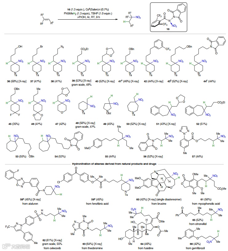 控制硝基自由基(·NO2)与烯烃在取代基较多的位置发生可控反应显然非常困难(图2a)。本文的主要挑战在于寻找一种能够在N而非O反应且不改变N氧化态的NO2供体试剂。首先,作者对烯烃23在各种MHAT条件下与众多潜在·NO2供体的氢硝化进行了广泛的探索。他们评估了Mn基、Fe基和Co基催化剂,其中Co-salen配合物被认为是最有希望的出发点。硝化剂候选物,则根据试剂在芳烃硝化和烯烃双官能团化中的应用实例和实验室稳定性从文献中筛选而来。2024年,作者曾报道了一类基于异头酰胺的强亲电卤化试剂,以高产率、高区域选择性和化学选择性实现了50多种化合物的卤化反应(Nat. Chem., 2024, 16, 1539,点击阅读详细)。鉴于其高反应性,他们猜测相应的异头硝基酰胺也可能会出现类似的反应性提高。但是一开始的尝试并不顺利,由于产物稳定性欠佳,所有制备类似的异头硝基酰胺(如34)的尝试都失败了(图2c,右上)。幸运的是,最终他们还是发现了提高产物稳定性的方法——将结构中N-O交换为N-N键(35A、35B、16)。有意思的是,尽管这些化合物可以通过两步简单合成,但据作者所知尚未有任何合成案例见诸报道。测试结果表明,使用异头硝基酰胺16(图2c,entry 9)时,27作为主要产物(产量53%),只有少量副产物26(5%)被观察到。最终优化的条件:将装有烯烃(1.0 当量)、CoII(salen)-I(0.7 mol%)和异头硝基酰胺 16(1.3 当量)的烧瓶用氩气吹扫,然后加入异丙醇(i-PrOH,0.12 M)、硅烷(1.3当量)和叔丁基过氧化氢(TBHP,1.0 当量)。室温搅拌 9 小时后,用饱和氯化铵水溶液淬灭反应,用二氯甲烷萃取并纯化。在最佳条件下,副产物 24 可以回收利用,得到所需的27,产率为 54%。虽然采用了干燥的 i-PrOH,但并不要求严格的无水条件。