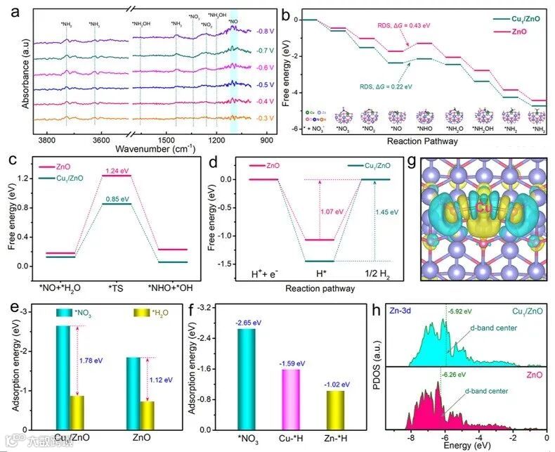 原位红外光谱揭示了Cu1/ZnO催化剂电催化硝酸盐还原合成氨的主要反应路径。DFT计算从反应中间体吸附强度调控角度阐明了单原子分散的Cu位点协同ZnO载体增强NO3RR活性的机理。
