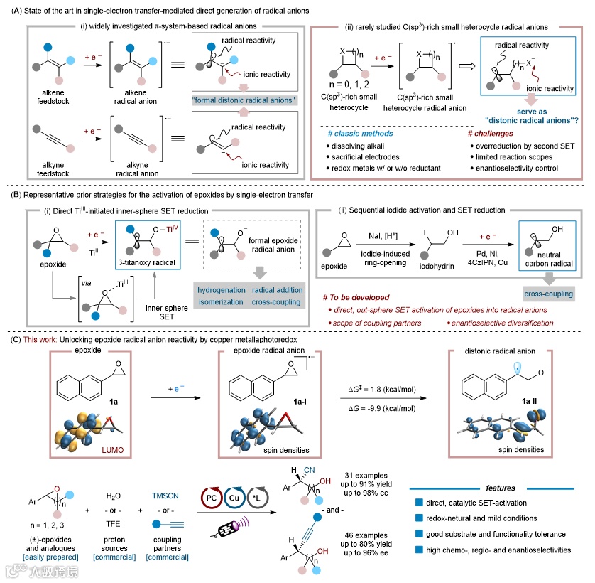 环氧化合物是一类重要的杂环小分子,可参与多种化学转化。过去几十年的研究表明,环氧化合物可通过单电子转移(SET)过程活化生成自由基中间体,进而参与多种自由基反应。该领域的重大突破主要得益于Ti(III)介导的还原催化体系(图1B,i)。随后,化学家们开发了基于碘代物的间接SET策略:首先对环氧化合物进行开环,生成的碘代醇进一步通过SET过程产生烷基自由基,并将其应用于多样化的化学转化(图1B,ii)。尽管环氧化合物自由基化学已取得一定进展,但目前仍缺乏简单、高效的催化体系,能够通过SET过程将环氧化合物直接活化为相应的自由基阴离子。