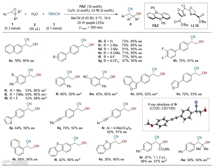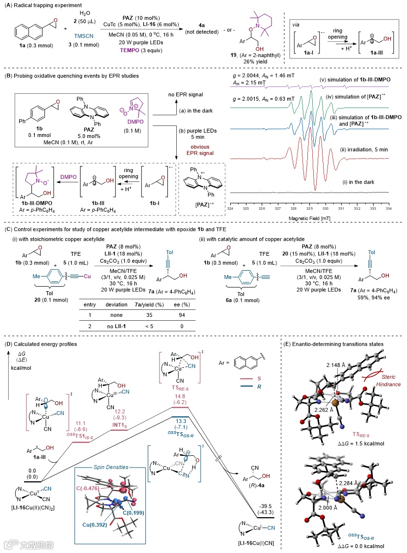 基于课题组前期在烯烃自由基阴离子领域的研究积累,并结合团队在光/铜协同催化不对称反应体系的长期探索,作者提出将自由基阴离子的催化策略拓展至环氧化合物体系,利用“荷基异位自由基阴离子”(distonic radical anion)构建一种通用且温和的不对称自由基交叉偶联平台。近日,华中师范大学肖文精与陈加荣团队通过可见光/铜协同催化策略,成功实现环氧化合物与亲核试剂的不对称自由基偶联反应,高效合成了一系列手性β-氰醇和高炔丙醇类化合物(图1C)。