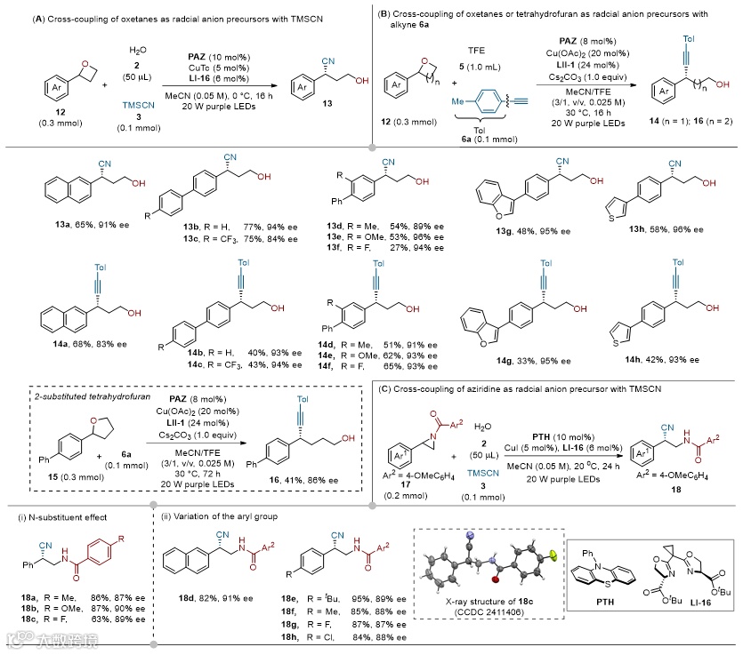综上所述,肖文精/陈加荣团队发展了一种通用的可见光/铜协同催化环氧化合物的不对称自由基偶联反应,通过产生“荷基易位”环氧化合物自由基阴离子,成功实现了环氧乙烷、氧杂环丁烷、氧杂五元环以及氮杂环丙烷的不对称自由基偶联反应,体现出极高的反应兼容性,并为小环化学和自由基阴离子化学提供了新的思路。