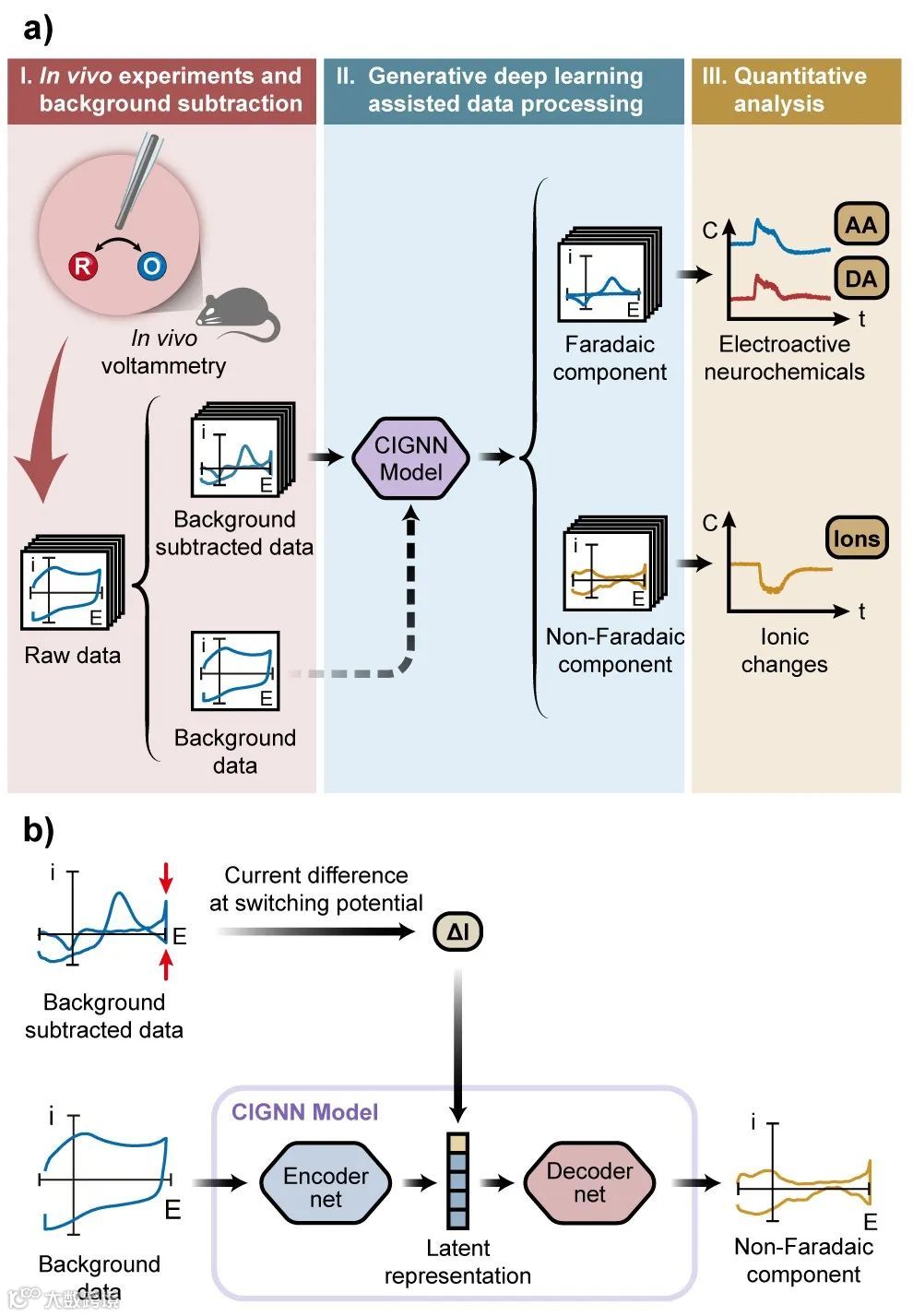该方法使用基于微电极技术的快速扫描循环伏安法(fast-scan cyclic voltammetry, FSCV)进行高时空分辨原位电化学数据采集。然而,传统FSCV分析方法容易在高扫速条件下受到非法拉第过程充电过程的影响从而造成背景电流漂移,为神经化学物质的定量分析造成困难。为了解决这一问题,毛兰群教授团队率先提出使用生成式深度学习算法预测FSCV数据中的非法拉第伏安响应,对不同电化学过程伏安响应进行区分从而实现精准定量。