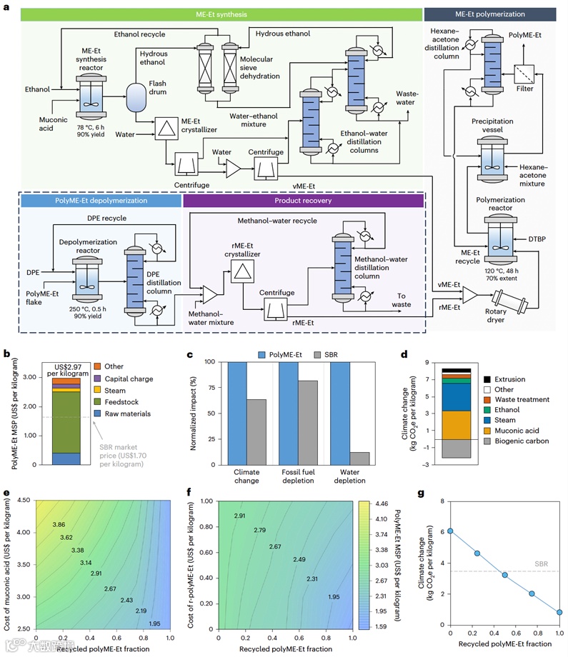 所使用的 muconate 酯类单体来自于生物基原料。这一分子设计不仅赋予材料可降解、可回收的属性,还从源头上减少对化石资源的依赖,有助于整体碳足迹的降低。尽管当前在年产10万吨的假设下,聚muconate材料的制备在成本与环境负载方面仍略高于传统合成橡胶,但研究表明,一旦化学回收路径被有效整合,生产成本可降至1.59美元/公斤,碳排放也将显著减少,使其在性能-成本-环境三重维度上具备商业化潜力。