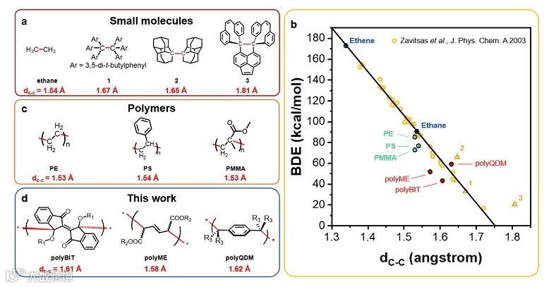 图1. (a, c, d) 不同小分子、传统聚合物和窦乐添教授课题组拓展的三种聚合物polyBIT、polyME和polyQDM的C-C键长(红色高亮)比较;(b)此三种聚合物骨架在键解离能(BDE)与碳碳键长(dC-C)关系图中的位置。图片来源:JACS
