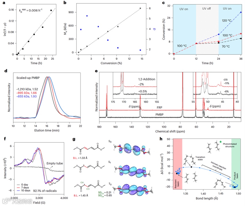 从机理角度来看,PMBP 兼具链式聚合(快速增长)与逐步聚合(链段偶联)的特性。研究者通过 EPR 和 DFT 分析表明,光照诱导的激发态单体会形成稳定的双自由基,这些自由基在反应过程中并不会快速终止,使得聚合过程呈现出“活性”增长的特征。计算结果进一步表明,在激发态下,单体的几何构型趋近于热聚合的过渡态结构,这解释了为何光照能有效驱动聚合,并偏好形成规整的 1,4-加成结构。这种机制与传统 RAFT、ATRP 等活性聚合路径有本质区别,双自由基赋予的链式与逐步聚合协同的概念是一种全新的聚合范式。