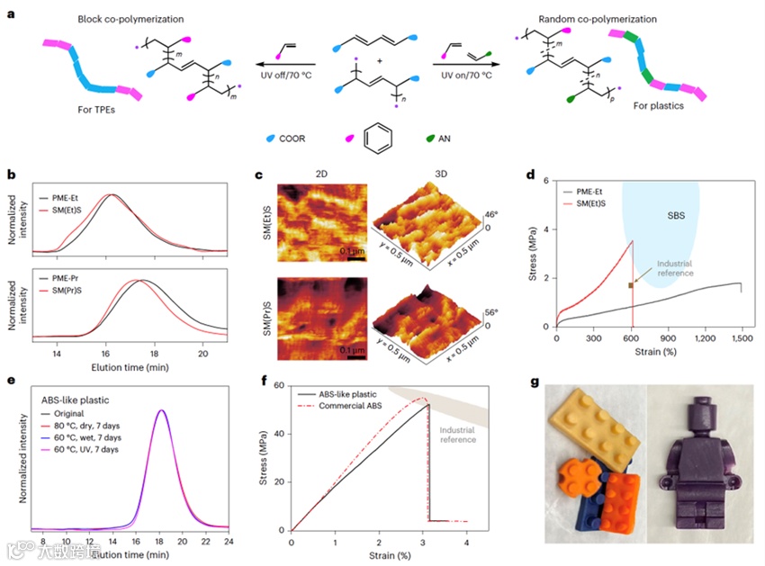 更令人惊喜的是,PMBP 策略同样适用于合成更复杂的嵌段共聚物和 ABS 类塑料。研究团队通过反应过程中加入液态单体并调控反应条件,实现了三嵌段共聚(PME-b-PS-b-PME)以及随机三元共聚。这些材料既具备良好的力学性能,又可以通过简单模具加工成玩具、器件等产品,展现出良好的热稳定性和可塑性。