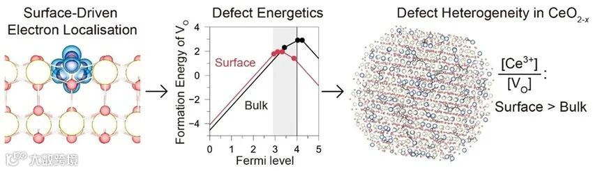 (3)应用层面的意义。该工作提出了“表面驱动缺陷异质性”的概念,清晰地解释了CeO2表面与块体内部缺陷的双重功能。表面区域是富电子环境(高Ce3+/VO••比例),有利于金属团簇的稳定与分子活化,是CeO2作为催化剂载体与反应活性中心的关键;体相区域是缺电子环境(较低的Ce3+/VO••比例),减少了Ce3+所引入的空间位阻,使氧空位更易迁移,从而提高离子导电性,对燃料电池电解质应用至关重要。