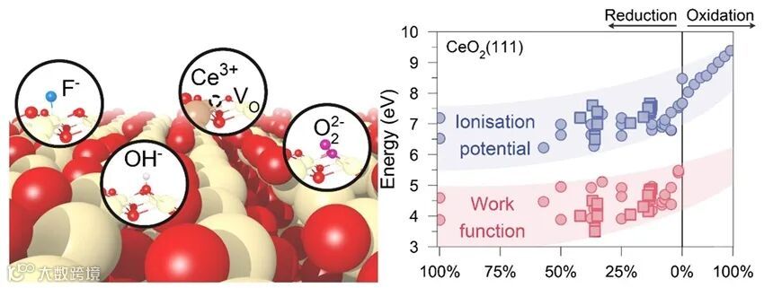 氧化物的带边位置不仅由体相决定,还会受到表面结构、缺陷分布以及外部环境的强烈影响。CeO2的电子结构和带边位置受环境影响尤为显著:在缺氧环境下,CeO2的电离势和功函数呈下降趋势,归因于表面附近的氧空位的形成;相反,在富氧环境下,表面过氧化物的形成会提高电离势和功函数。即使在相同化学计量比的CeO2-x中,表面不同的缺陷构型可引起高达1 eV的功函数和电离势差异,解释了实验测量出现差异的主要原因。这一工作结合了基于shell-model势函数的静电分析、DFT计算、QM/MM模型,以及XPS/UPS实验表征,强调了环境与缺陷的协同作用,为CeO2在光催化和电子器件中的能带调控提供了理论依据。