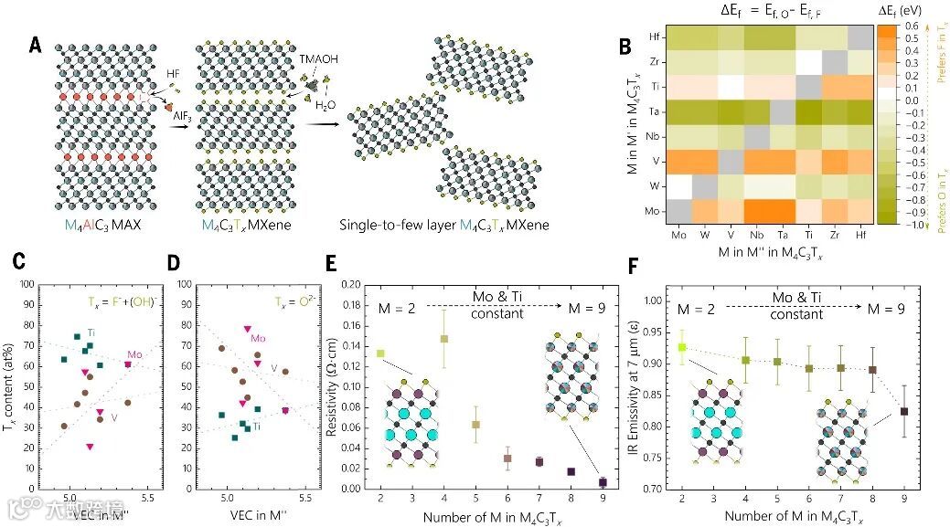 采用湿法剥离,可以将M4AlC3 MAX相转化为M4AlC3 MXene薄膜。研究发现,MAX相中金属原子的有序或无序排列会延续到其衍生的MXene材料中,显著影响表面官能团。随着过渡金属种类从4种增加至9种,MXene表面的-O含量显著上升,而-OH 和-F含量下降,表明高熵带来的无序性改变了表面终止基团的化学偏好。DFT计算验证了这一发现,表明MXene表面不仅受金属种类和数量影响,还受到其在晶格中有序或无序的空间排布、以及其与电子结构之间相互作用共同调控。