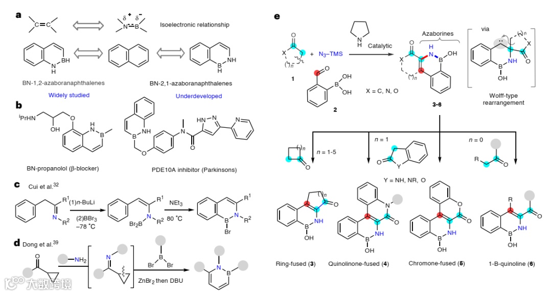 在药物研发领域,利用分子骨架的多样化来改善性能是药物设计和新药开发的关键,不过,该过程通常需要费时费力费钱的从头合成。近年来,生物电子等排取代已成为修饰现有生物活性化合物的重要工具,特别是苯并氮硼烷作为萘的电子等排体引起了广泛关注(图1a),它们通常比母体萘分子具有更好的代谢稳定性和水溶性,这可能是由于氮硼烷的NH基团可以作为氢键供体,从而与蛋白质更好地结合(图1b)。然而,迄今为止仅有少量报道能实现BN电子等排体的合成,并且大多数仅限于BN-1,2-氮杂硼萘烷异构体(又称为2,1-硼氮杂萘)。相比之下,其区域翻转结构BN-2,1-氮杂硼萘烷(或1,2-硼氮杂萘)的合成报道却较少,例如: 2015年,崔春明课题组通过苯乙基亚胺、丁基锂和卤代硼烷之间的反应获得氮杂硼中间体,再进行亲电环化便能获得1,2-硼氮杂萘(J. Org. Chem., 2015, 80, 3737-3744,图1c);去年,董广彬课题组在ZnBr2的存在下,利用胺、二溴硼烷和环丙基酮的三组分两步反应合成了单环1,2-硼氮杂环(Nat. Chem., 2024, 16, 269-276, 图1d)。