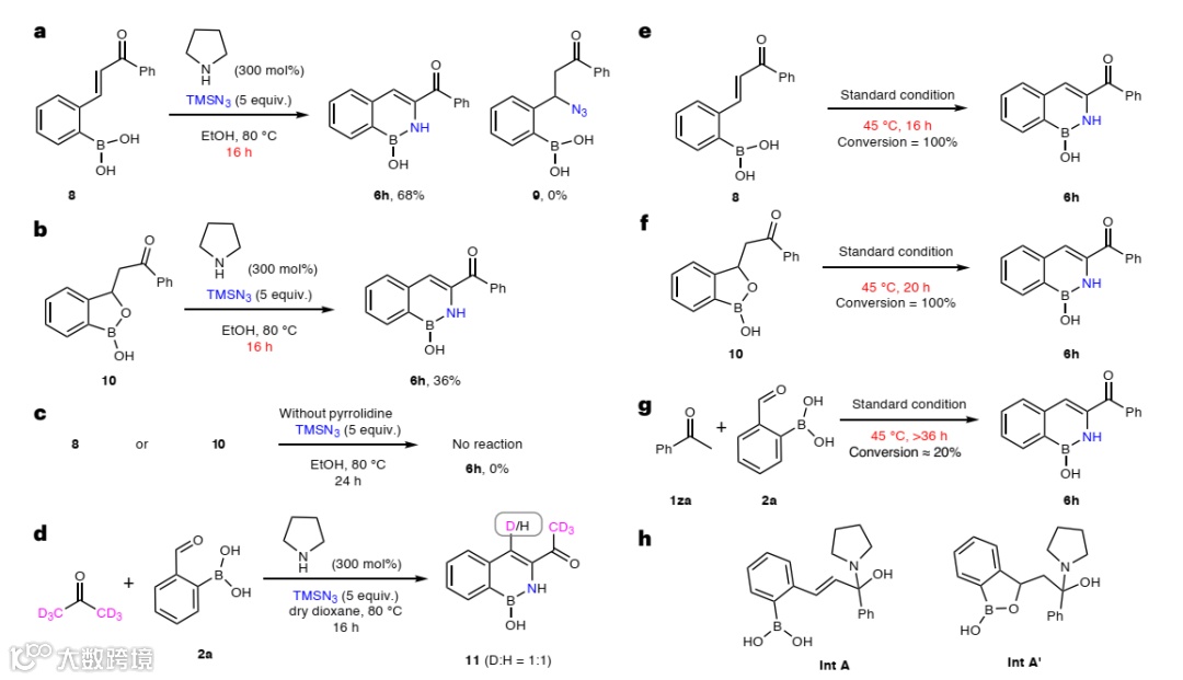为了进一步探究反应机理,作者进行了一系列实验。具体而言:1)将羟醛中间体8(由2-甲酰基苯硼酸和苯乙酮的Wittig叶立德反应制备而成)和苯并氧硼烷10(由8转化而成)置于标准条件下进行反应时,分别以68%和36%的产率获得所需产物6h(图5a、5b),同时没有观察到Michael加成产物9,这说明8可能是6h形成的主要甚至唯一中间体;2)无吡咯烷时,这些中间体(8或10)无法进行反应(图5c),进而表明吡咯烷在后续转化(8或10→6h)中起着关键作用;3)2a与丙酮-d6在干燥的二噁烷中进行反应时得到了产物11(D:H=1:1,图5d),这表明丙酮-d6的CD3基团发生了[1,2]-氘迁移;4)当中间体8(图5e)、10(图5f)以及苯乙酮和2-甲酰基苯硼酸(图5g)分别在标准条件下于45 ℃进行反应时,中间体8和10的反应速率更快,这说明第一步(即中间体8或10的形成)反应最慢;5)分子离子峰(Int A/A′)的表征表明形成了烯基或苯基硼酸酯加合物8和10(图5h)。