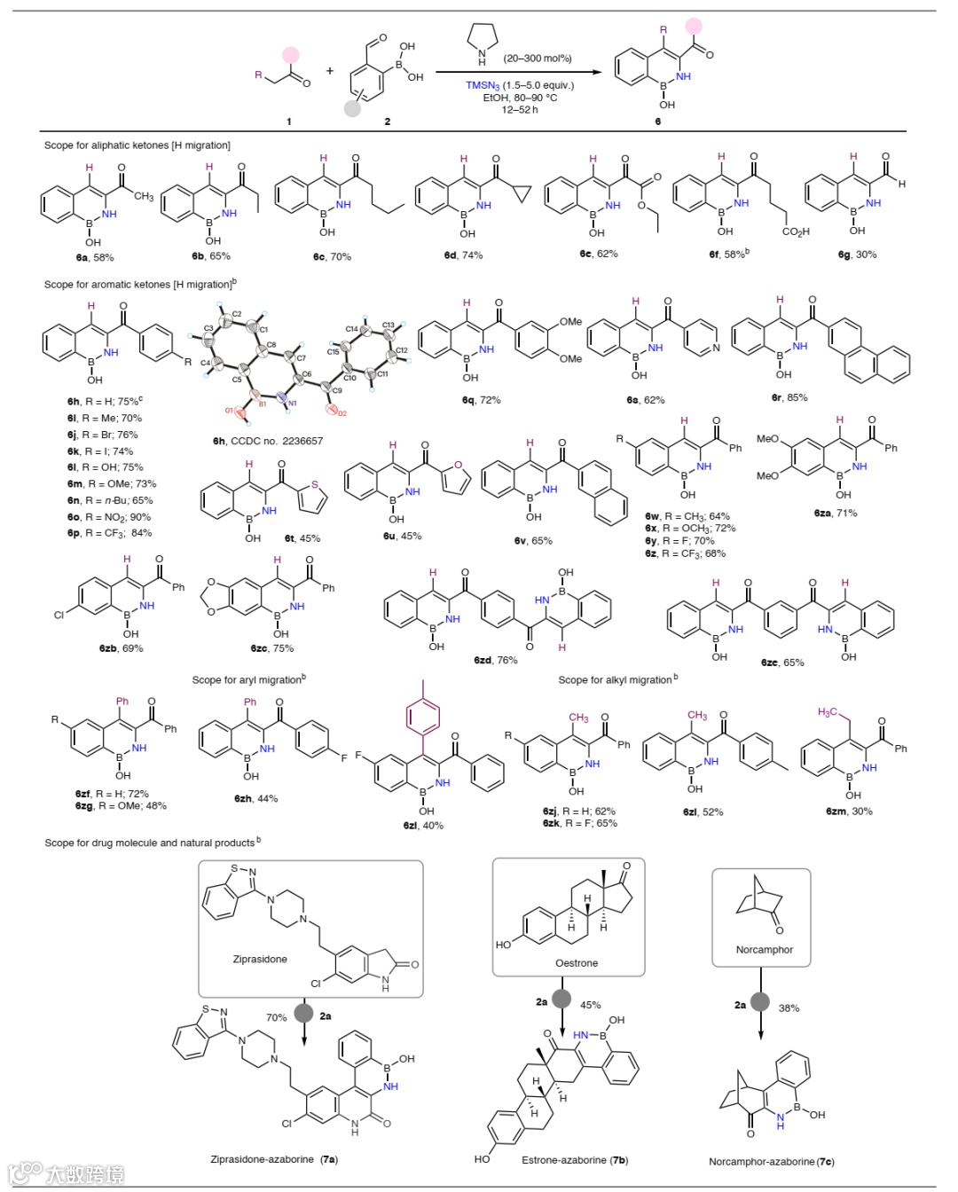 接下来,作者研究了非环状酮的反应效果(图4),结果显示丙酮(6a)、丁酮(6b)、2-己酮(6c)、环丙基甲基酮(6d)、丙酮酸甲酯(6e)、5-氧代己酸(6f)、丙酮酸(6g)均能兼容该反应,以中等至良好的产率(30-74%)获得所需产物,尽管丙酮酸甲酯(6e)进行反应时生成了相应的酯交换产物——氮硼烷乙酯。其次,苯乙酮在标准条件下进行反应时仅产生痕量的所需产物6h,为此作者对反应条件进行稍加修改(吡咯烷(300 mol%)、TMSN3(5 equiv)),最终以78%的产率(分离产率:75%)获得6h,特别是6h还能进行4.4 mmol规模反应(0.8 g,产率:72%)。类似地,一系列带有不同供/吸电子基团的芳香酮(6h-6ze)、多环芳香和杂芳基甲基酮(6r-6v)甚至不同基团取代的2-甲酰基芳基硼酸(6w-6zc)均能顺利地转化为相应的氮硼烷,特别是1,4-二乙酰苯(6zd)和1,3-二乙酰苯(6ze)分别以76%和65%的产率合成双氮硼烷。值得一提的是,吸电子基团取代的芳香酮(14 h,80°C)要比供电子基团取代的芳香酮(22-36 h,90°C)反应速率更快,这说明该反应可能是通过亚胺/烯胺化学形成烯醇化物进行的。另外,作者还研究了[1,2]-芳基(6zf-6zi)和烷基(6zj-6zm)迁移,并以中等至良好的产率获得相应产物,甚至非典型抗精神病药齐拉西酮(7a)和生物活性化合物(如:雌酮(7b)、降樟脑(7c))也能实现这一转化,进一步展现出该方法的实用性。