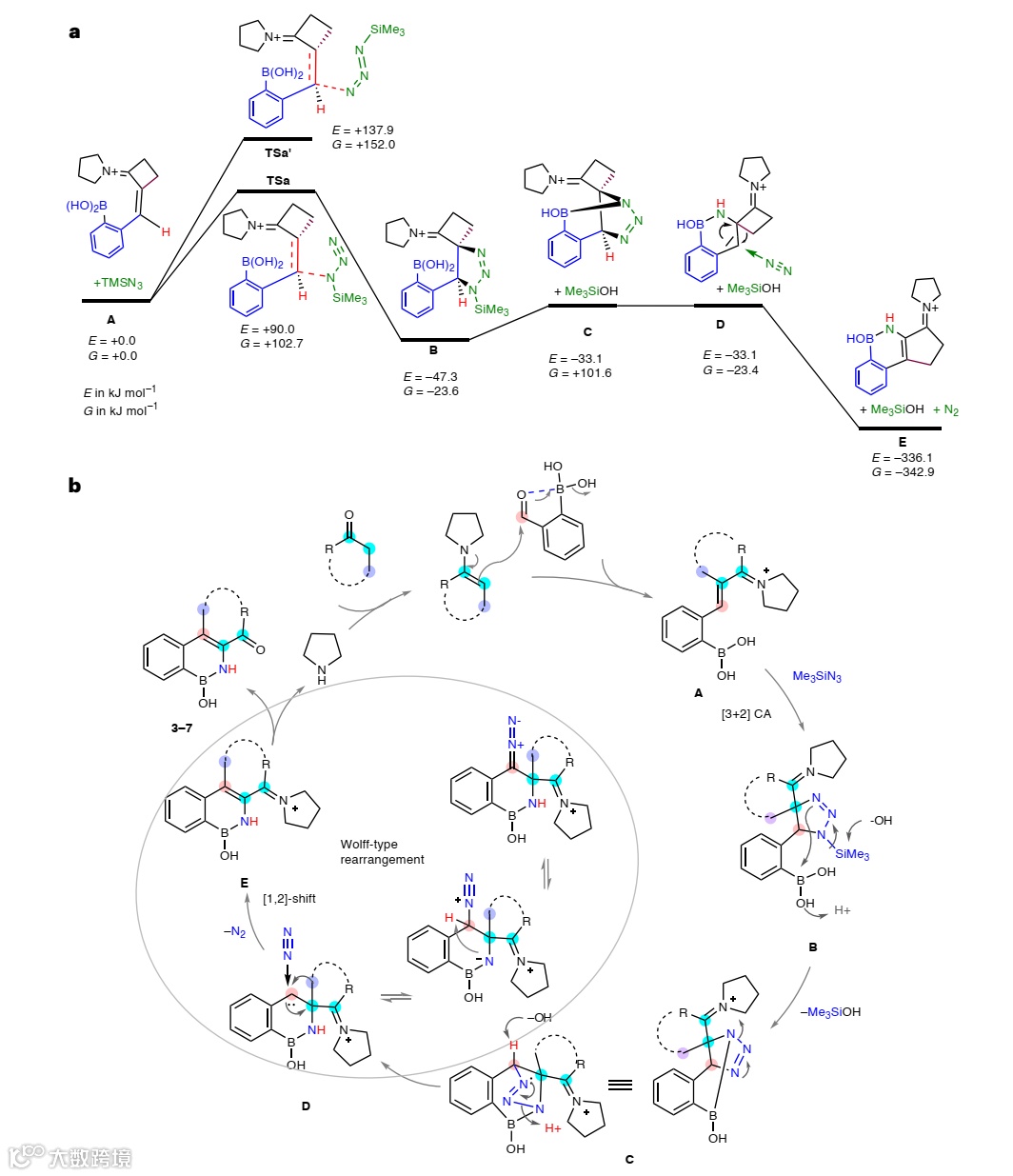 另外,作者还进行了密度泛函理论(DFT)计算(图6a),并基于此提出可能的反应机理(图6b):首先,酮1和吡咯烷、苯基硼酸2的活性甲酰基原位形成亚胺化合物A,A的烯基与TMSN3进行[3+2]环加成反应并得到螺环二氢三氮唑B,该过程的区域选择性主要由动力学控制(能量差为49.3 kJ mol-1)。由于硼的亲电性,中间体B会形成B-N键并得到桥联型中间体C,同时消除Me3Si-OH。随后,不稳定的二氢三氮唑C开环、释放N2并形成卡宾或重氮型中间体D,D经[1,2]-C-C或C-H迁移(类似于Wolff型重排)得到中间体E,特别是[1,2]-迁移是由热力学稳定的氮硼杂萘E的形成驱动的。最后,E经水解便可得到所需产物。
