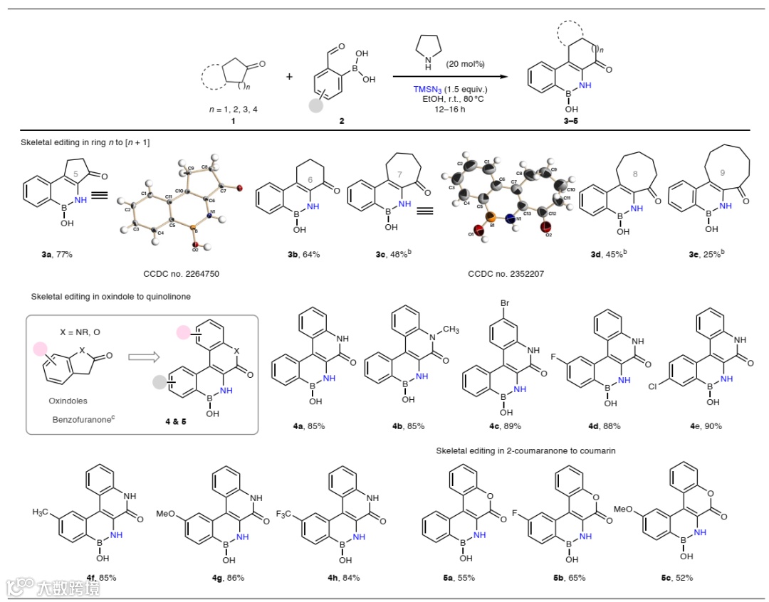 如图2a所示,作者假设该反应是通过以下过程进行:首先,酮1和苯基硼酸2的活性甲酰基经亚胺/烯胺催化形成羟醛缩合产物I,再与叠氮化物进行[3+2]环加成反应并生成螺环二氢三氮唑II。此时,硼的亲氮性能否通过N2释放形成稳定的B-N键?若能形成,那么中间体III的环张力会通过[1,2] C-C迁移形成[2,1]-苯并氮硼烷(3和3′),或者通过螺环氮丙啶的形成来实现。为了验证这一假设,作者选择环丁酮1a、2-甲酰基苯硼酸2a和TMSN3为模板底物对反应条件进行优化(图2b),结果显示在20 mol%吡咯烷的存在下能以81%的产率形成环戊酮稠合[2,1]-硼氮杂萘3a(NMR和X-射线衍射分析证实其结构)而非3a′,同时对照实验表明吡咯烷对于该反应至关重要。
