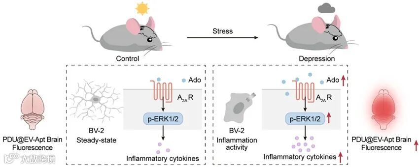 基于探针对腺苷的时空成像,研究发现抑郁小鼠脑内腺苷水平升高,并伴随炎性因子在脑内的表达上调。进一步结果表明,腺苷能够通过结合小胶质细胞的A2A受体,诱导细胞外信号调节激酶1/2通路活化,增加促炎因子的分泌并增强神经炎症反应。同时,外周血液中也检测到炎症水平的同步升高,提示中枢腺苷信号的变化会影响外周免疫状态。综上,该工作验证了该探针在病理条件下对腺苷的特异性成像能力,并揭示了抑郁中腺苷和炎症之间的关联。