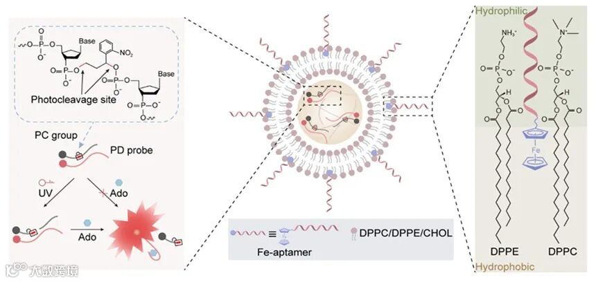 该探针集成了两个模块:光控模块利用上转换纳米粒子将近红外光转换为紫外光,切断含光敏基团的互补链,从而恢复适体对腺苷的识别活性;靶向模块则由二茂铁修饰的靶向适体与脂质体自组装而成,实现对脑部的靶向递送与腺苷的选择性识别。这一策略提升了探针的成像特异性和时空调控能力。