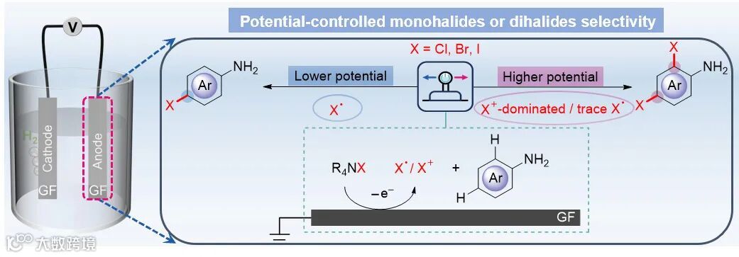 重庆大学团队开发的电位控制电化学卤化策略,巧妙地解决了上述难题。该方法的核心在于利用电极电位作为“调控旋钮”。研究人员发现,通过简单改变施加在电极上的电势,可以精准控制反应中关键活性中间体的生成:在较低电位(1.38 V vs SHE)下,主要产生卤素自由基(X·),其倾向于高选择性地进攻苯胺的对位,生成单卤代(对位)产物;而当电位升高至2.88 V vs SHE时,则主要生成卤素阳离子(X+),X+主导/痕量X·与苯胺发生取代反应,高选择性地形成二卤代产物。尤为重要的是,只需调节电位这一参数,其他反应条件(底物、电解质、溶剂、温度等)完全保持不变。