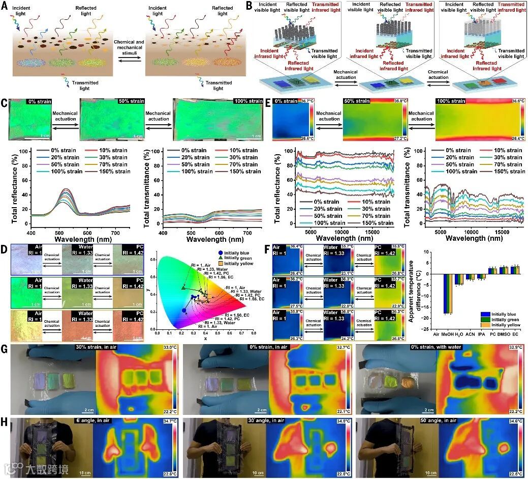 进一步地,将具正弦折射率分布的反射层与金属薄膜层相结合,研究者实现了在可见光至红外光范围内的动态变色与热调控功能。这些柔性复合材料在拉伸时变得更透明,受到化学刺激时颜色发生变化,同时展现出由金属薄膜调控的热外观与可调的表面温度,温度变化范围从-18°C至+4°C。材料还具备优异的机械性能,并能在不同角度和环境下保持稳定的光热响应。此外,凭借对从可见光到红外波段的精准调控能力,这类材料的大面积阵列有望应用于人体伪装系统等场景。