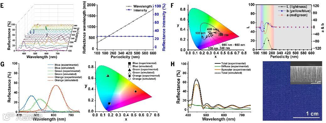 通过计算建模发现,当结构周期不超过300 nm,且最大折射率低于1.5时,反射结构可同时实现鲜明的结构色和接近完全透明的状态,能够很好地模拟单个虹彩细胞表现出的窄带反射和高纯度色彩。相较之下,若采用三角波或方波形折射率分布,虽然也可产生色彩,但透明性将显著下降。这表明乌贼色斑之所以能在透明与高纯度结构色之间灵活切换,关键在于其虹彩细胞内部具有正弦波型的折射率分布。