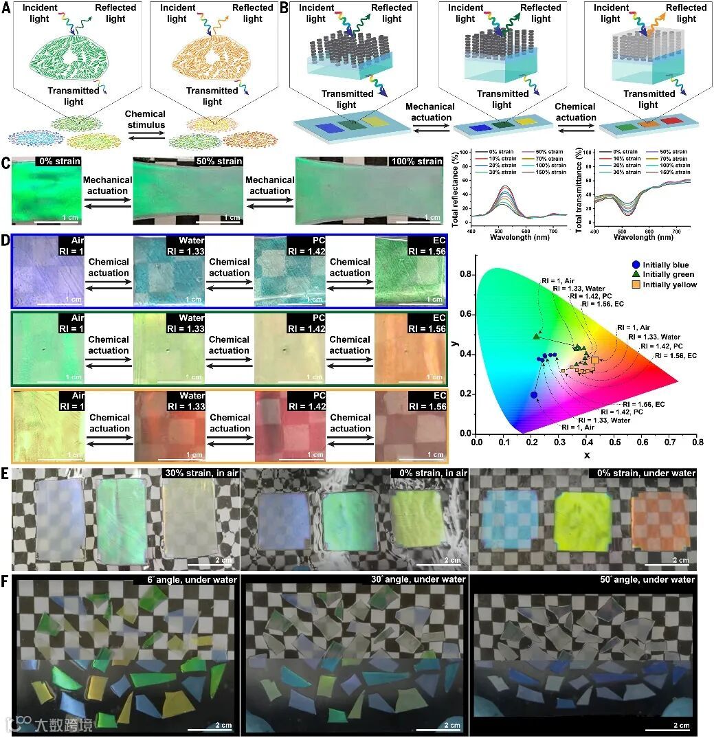 受乌贼背部虹彩细胞结构的启发,研究者利用具有正弦波折射率分布的纳米柱状金属氧化物复合材料,成功构建出仿生布拉格反射薄膜,可呈现鲜艳的蓝色、绿色和黄色。当施加机械应变改变其表面微结构时,材料的色彩饱和度明显降低;通过化学刺激调控其内部折射率,还可实现颜色变化,如蓝变绿、绿变橙或黄变红,最大波长位移可达90 nm,并伴随一定程度的透明度变化。材料在水中表现出明显的颜色红移,在棋盘格背景下呈现类似“伪装”的视觉效果,尤其在改变观察角度时,这种效果更加显著。