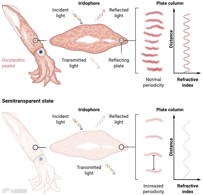 乌贼虹彩细胞内的反射板排列方式改变折射率。图片来源:Science [2]