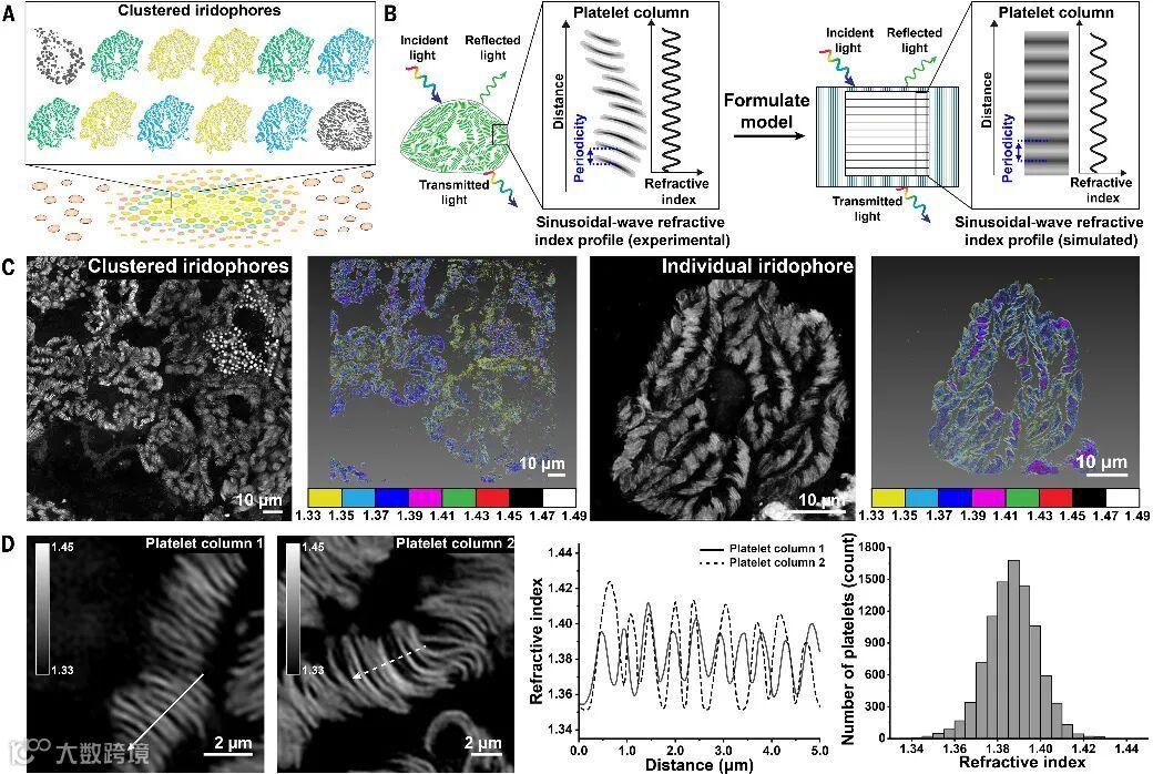 从不同角度观察时,单个色斑可展现出跨越约150 nm波段的虹彩结构色。通过共聚焦显微镜、免疫荧光成像和微光谱分析,进一步揭示了色斑内部存在三种类型的虹彩细胞。其中大多数(约96%)富含螺旋状板条柱结构,其余小部分(各约2%)分别包含分布式堆叠圆盘结构和密集的球状颗粒。相比之下,色斑外围的虹彩细胞主要由两种已知类型构成,分别具有平行褶皱状板条结构或人字形直板条结构。色斑内部的三种虹彩细胞在形态学特征上与外围两种类型显著不同。
