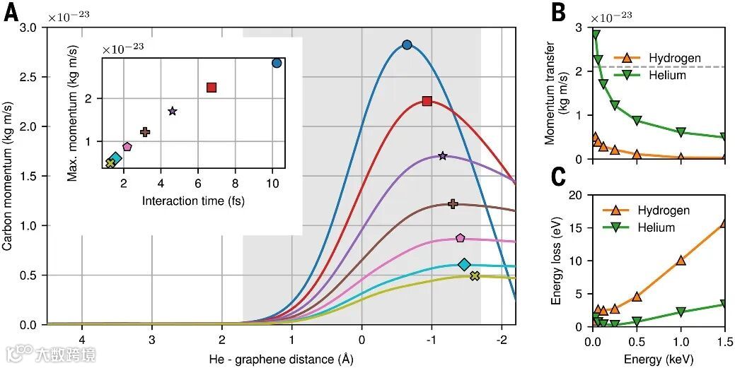 人们已经知道,常温常压下,氦原子无法穿透石墨烯。模拟结果表明,适当提高原子能量有助于其穿透晶格,且不会显著增加动量传递,因为能量升高会缩短原子与晶格的相互作用时间。对于氦原子而言,能量范围在400–600 eV之间可以在动量转移与能量损失之间取得良好平衡,是实现相干衍射的理想条件。而对氢原子而言,由于其具有单个未成对电子,与石墨烯耦合更强,因此能量损失更加显著。