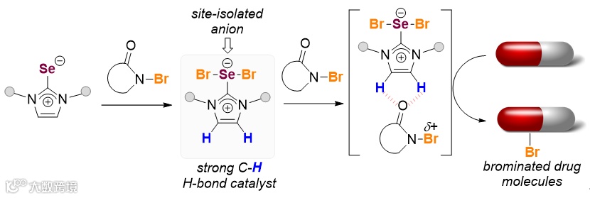 在实际应用中,分子卤素(如Br2)因廉价易得而常被使用,但其高挥发性、强腐蚀性、选择性差及潜在的安全风险限制了应用。相较之下,稳定的N-卤代酰胺(如NBS)被视为替代试剂,但其反应活性偏低,通常需要额外活化剂。近年来,研究者发现软性硒基路易斯碱(如硒脲)能够高效活化N-卤代酰胺。按照传统机理,氮原子的电子给体效应增强了硒的路易斯碱性,从而通过n→σ*相互作用促进NBS中酰胺阴离子的解离,生成高活性的硒–卤正离子加合物,进而实现温和条件下的卤代转化。
