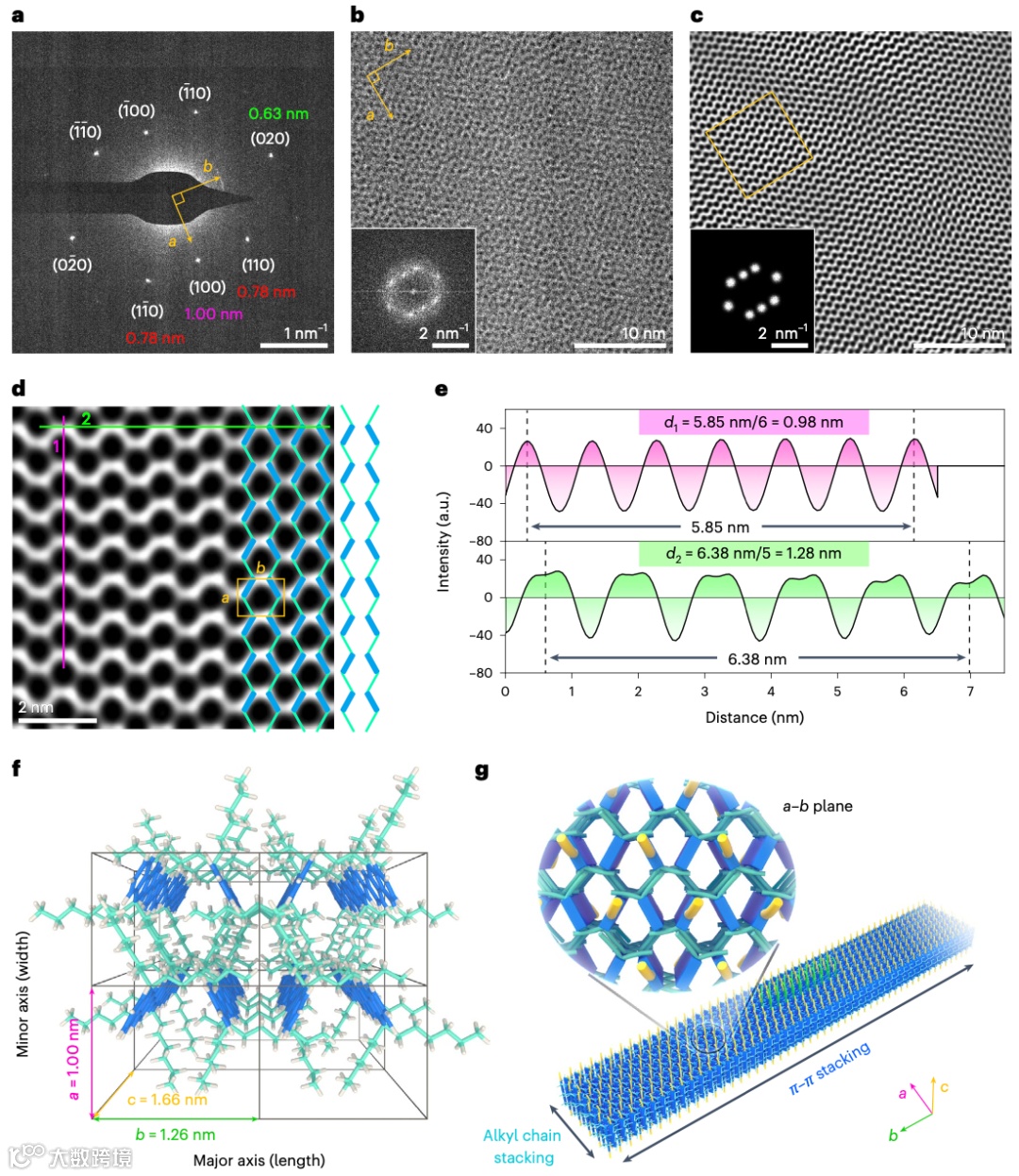 通过高分辨成像技术,作者揭示了结晶内核高度有序的类鱼骨状分子排列(图2)。在长度生长方向,共轭骨架通过V型π-π堆积构筑锯齿状阵列;在宽度方向上,共轭骨架则借助烷基链的有序连接而保持彼此平行。同时,溶剂舒展的壳层链段分布于二维片状胶束的上下表面,为整体结构提供了胶体稳定性。