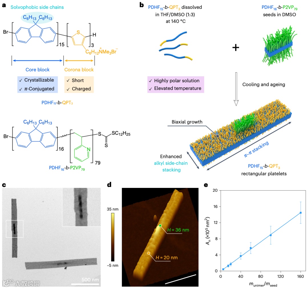 作者立足于共轭聚合物聚芴(PDHF)体系,开发了一种高温辅助的种子增长策略,有效增强了垂直于π–π堆积方向的烷基链堆积,实现了同步的双轴生长,从而成功构筑出尺寸均一的矩形纳米片(图1)。二维结构的面积可以通过投入的聚合物与种子的质量比进行精准预测,顺序加入不同批次的聚合物可以制备得到具有同心环绕特征的嵌段片状纳米结构。