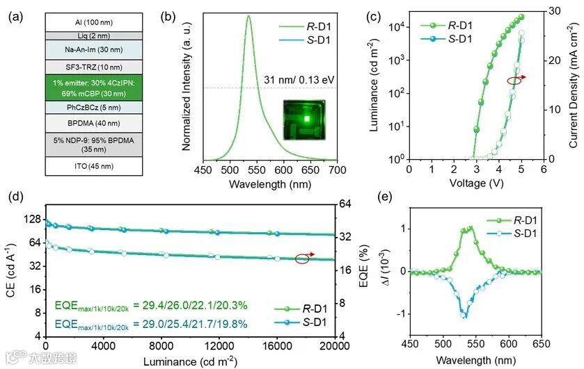 基于R(S)-PCP-DBNO构建的敏化CP-OLED器件实现535 nm的最大发射峰和31 nm的半峰宽,CIE坐标为(0.30,0.67)。值得注意的是,敏化剂与客体的协同作用使电致发光器件突破241k cd/m2的超高亮度和29.4%的外量子效率,并且在20,000 cd/m2高亮度下仍保持在20.3%。此外,“手性空间共轭”结构赋予器件稳定的圆偏振电致发光特性,电致发光不对称因子∣gEL∣在不同亮度下都能维持在10−3量级。