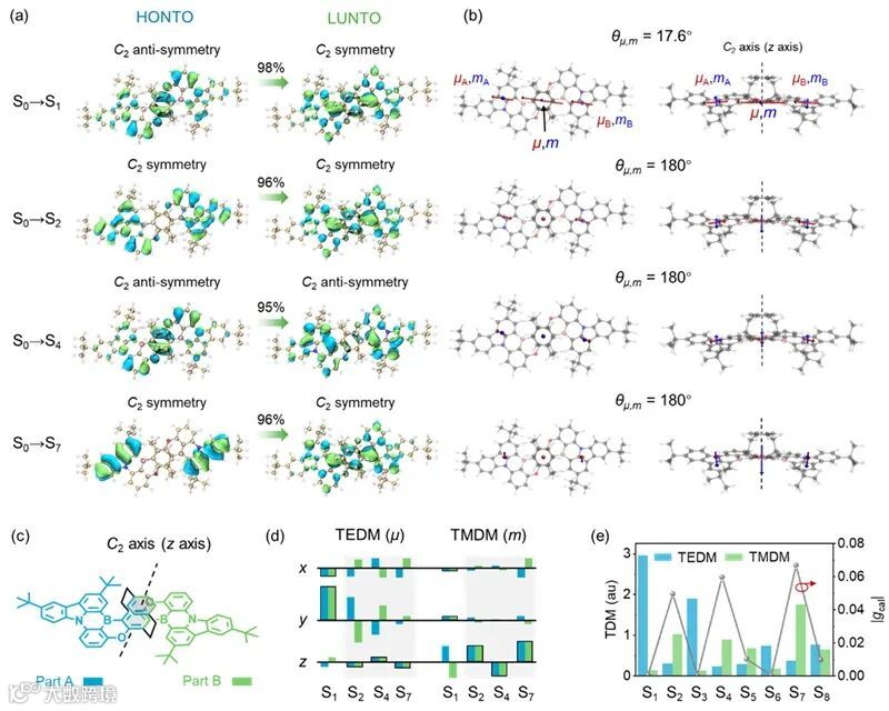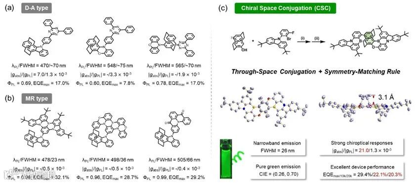 近日,季华实验室毕海、晏志平研究团队提出一种“手性空间共轭”分子设计策略,成功制备出兼具窄谱发射、强圆偏振响应和高效率的绿光多重共振(MR-TADF)材料。研究团队以具有平面手性的[2.2]对环芳烷(PCP)为核心构建单元,通过精密分子工程在PCP核两侧对称连接B-π-B和O-π-O共振片段,构建了具有C2对称性的R(S)-PCP-DBNO分子。基于研究团队前期提出的“对称性匹配规则”调控机制(Adv. Mater. 2022, 34, 2204253),该设计优化了电/磁跃迁偶极矩的相对强度和空间取向,使分子片段跃迁磁偶极矩基本平行于C2对称轴,实现迭加增强的效果,相应的跃迁磁偶极矩强度最大可提升至1.74 au,理论不对称因子(g)达到0.06。同时,“手性空间共轭”效应有效降低了材料激发态能级,也为MR-TADF材料的光色调节开辟了新路径。