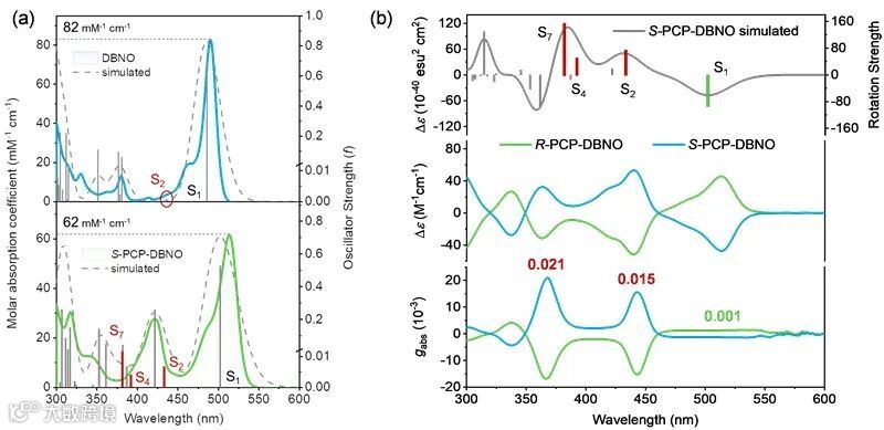 实验验证显示,在甲苯溶液中,增强的磁跃迁偶极矩使原本禁阻的S0→S2跃迁转为部分允许,实现一种磁跃迁偶极矩辅助的能级跃迁。归因于增强的磁跃迁偶极矩,手性单体在393和439 nm处表现出较大的吸收不对称因子(gabs),分别为0.021和0.015,显著超越多数手性有机小分子。独特的空间共轭结构同时赋予材料纯绿光发射特性,最大发射峰为526 nm,半峰宽仅为26 nm,量子产率在0.9以上,CIE坐标为(0.26, 0.70)。
