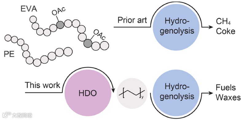 清华大学化工系牛志强团队通过研究发现,积碳产生的原因在于EVA受热分解会产生多烯片段以及乙酸,二者均是积碳的来源。据此作者提出了“加氢脱氧-氢解”串联催化的策略解决这一问题:为避免EVA受热分解产生积碳物种,首先通过高活性加氢脱氧催化剂将EVA侧链乙酸基快速转化为CH4和H2O,EVA主链则以聚乙烯形式进一步通过氢解转化为液体燃料和蜡。