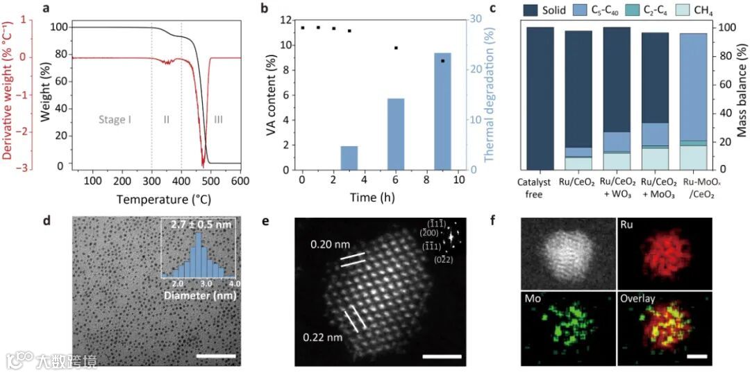 为实现上述串联催化,作者通过胶体法制备了粒径均一的Ru-MoOx纳米颗粒,结构表征表明,Ru元素与Mo元素在颗粒中均匀分布,Mo元素全部以氧化态形式存在,Ru与MoOx在颗粒中紧密接触。作者对比了不同催化剂的氢解性能:直接使用Ru/CeO2氢解EVA-12时,转化率不足20%;将Ru/CeO2与WO3或MoO3物理混合后,固体转化率显著提高;而通过胶体法合成的Ru-MoOx纳米颗粒,对EVA的固体转化率从20%提升至96%,液态产物收率达到75%。