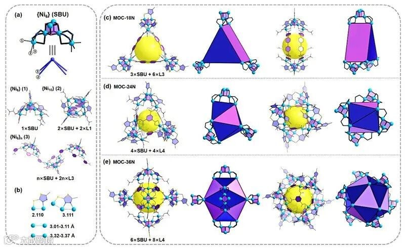 西安交通大学郑彦臻教授团队前期研究发现,2-巯基-5-甲基-1,3,4-噻二唑(Hmmt)是一种基于N和S原子的多齿有机配体,在构筑3d-4f异金属团簇时可以与3d金属结合,更重要的是,发现巨大的{Ni36Gd102}轮状结构在可见光下能有效地把CO2转化成CO。在此研究基础上,他们通过采用Hmmt作为一种新的封端配体合成了一个新颖的{Ni6}节点,其可进一步聚合成{Ni10},延伸成一维链{Ni6}n,更引人注目的是,通过使用更长的双齿或三齿连接体,可以组装出离散的纳米笼:三棱柱形的MOC-18N(其中N代表镍),类四面体的MOC-24N和八面体的MOC-36N。基于{Ni6}节点的可控自组装探索为基于簇的MOCs的研究提供了重要范例。