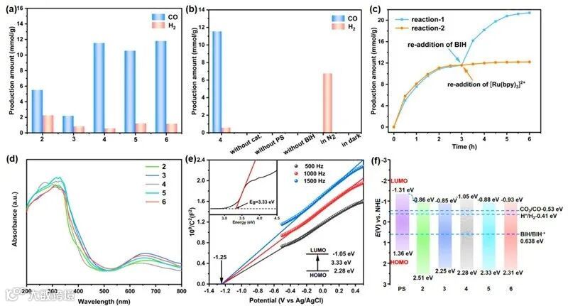 此外,由于活性翼状Ni(II)离子与溶剂分子的辅助配位,这些金属有机笼在可见光下能够有效地、选择性地将CO2转化为CO。它们的转换频率均大于3500 µmol·g−1·h−1,选择性高于90%。与先前报道的MOCs笼空间用于CO2还原的使用情况相比,性能要高得多,并且与大多数基于Ni(II)的简单配位化合物相比也颇具竞争力。
