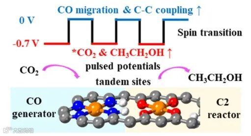 近日,吉林大学化学学院刘靖尧教授团队在C2产物定向合成领域提出了“时空分离”脉冲串联电催化新策略,开辟了多碳产物精准调控的新路径。该团队模拟自然界多酶协同机制,构建了具有空间分离双功能活性位的单原子纳米酶催化剂,分别负责CO2初步还原和后续C–C偶联,并借助巨正则系综下恒电势DFT计算(GCE-DFT)系统揭示了其分步反应路径与协同机制,成功实现对乙醇产物选择性的显著提升。该结构实现了C1与C2路径的有效空间分离,有助于提升乙醇生成的反应选择性。进一步地,团队引入脉冲电催化策略,通过施加周期性变电位(–0.7 V 与 0 V)精细调控各关键步骤的反应速率与方向。在–0.7 V下,催化剂有利于CO2吸附及中间体*CH3CH2OH生成;而在0 V时,CO迁移与C–C偶联过程得到显著促进,同时可抑制中间体的过度还原。通过调节脉冲周期,实现了乙醇路径热力学与动力学的双重提升。在此基础上,研究进一步拓展至Mn、Co、Ni、Cu、Zn等金属中心验证策略普适性。其中CoN4/CoO4双位点体系亦展现出良好的催化性能与脉冲响应,表明该策略在多种催化体系中具有广泛应用潜力。