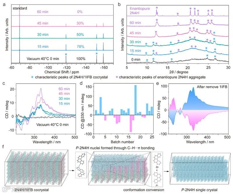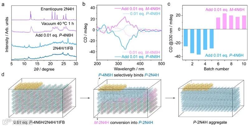 通过添加微量的手性引发剂,固态对称性破缺的手性能够被精准控制。如图7所示,在2N4H/1IFB的共晶体系中添加0.01当量具有固定手性的4N6H后,对称性破缺产生相应的单一手性。这可能是由于在固态界面上特定手性的4N6H选择性结合单一构象的2N4H生成手性核,随后通过分子间相互作用进行手性传递,手性逐渐被放大并最终产生对应的同手性聚集体。