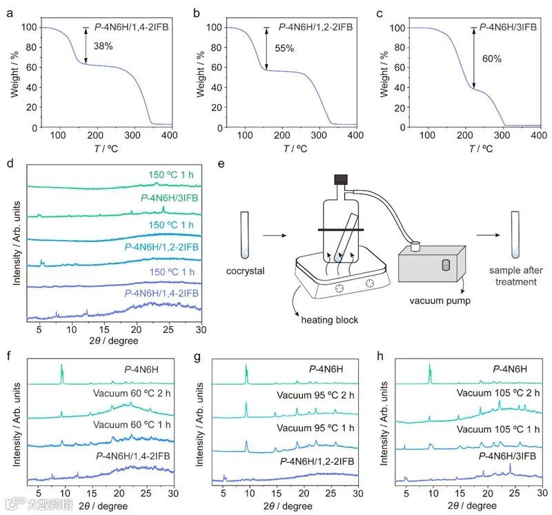 由于卤素键合作用相对较弱,通过加热可以完全去除共晶中的卤化物。如图2所示,TGA曲线表明共晶在加热过程中的第一段失重与相应卤化物的重量完全匹配。但是由于卤化物的沸点较高,常压下加热去除卤化物后的聚集体失去了结晶性。因此,研究人员开发了在真空下加热移除卤化物的方法,以大大降低卤化物的移除温度。这一方法获得了显著的成效。三种共晶在移除相应的卤化物后,残余的P-4N6H均进行了有序的重新排列,生成了单晶。