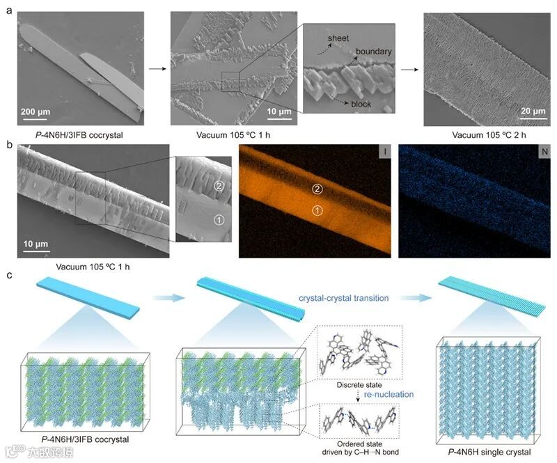 值得一提的是,在移除3IFB后,共晶的形貌由片状变为了紧密排列的规整块状结构。如图3所示,EDS结果表明,块状结构区域的碘元素含量显著减少,而氮元素含量维持不变。这说明块状结构是由移除3IFB后残余的P-4N6H重新排列形成的。根据形貌图片中片状和块状结构交界处的锯齿状边缘和两种晶体中分子的堆积方式对比,研究人员推测出3IFB的去除产生了一定的自由空间,从而允许残余的P-4N6H通过相邻分子间的C–H•••N作用进行重新排列,生成新的单晶。