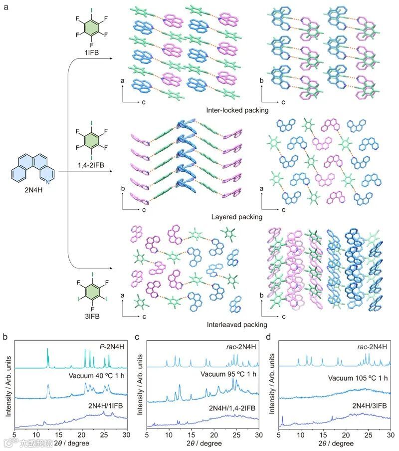 随后,这种通过移除卤化物来诱导氮杂螺烯有序重排的策略被应用于在溶液中具有动态螺旋结构的2-氮杂[4]螺烯(2N4H)分子。如图4所示,在C–I•••N卤素键的介导下,2N4H与三种卤化物形成了多样化的共晶。其中,P和M构象的2N4H在共晶中以同等数量被固定,表现出整体消旋性。在移除相应的卤化物后,残余的2N4H表现出了不同的重排倾向。特别地,在40 °C 的真空加热条件下将1IFB去除后2N4H重排产生了手性聚集体。相比之下,具有较高移除温度的1,4-2IFB和3IFB离去后只能诱导残余的2N4H产生消旋的聚集体或者失去结晶性。