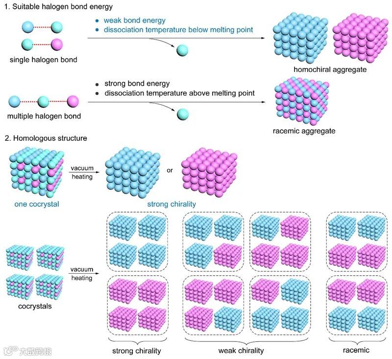 这种固态对称性破缺的产生依赖于两个主要因素。如图6所示,第一个因素是合适的卤素键强度。较弱的分子间卤素键使得卤化物移除温度较低,为残余的氮杂螺烯重排生成单一手性聚集体提供了先决条件。而较强的分子间卤素键使得卤化物只能在较高的温度下被移除,促使了残余的氮杂螺烯分子倾向于进行整体消旋的排列。第二个重要的因素是同质化的结构。长程有序的均一晶体结构有利于分子间相互作用的传递。单一的均质结构将生成同一手性的聚集体。而多个非均质结构将随机的生成两种手性的聚集体,使得整体倾向于消旋化。